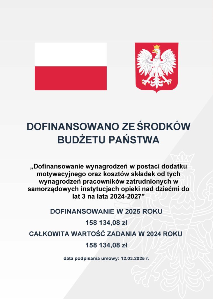 Na mocy Uchwały nr 64 Rady Ministrów z dnia 19 czerwca 2024 r. został ustanowiony rządowy program „Dofinansowanie wynagrodzeń w postaci dodatku motywacyjnego oraz kosztów składek od tych wynagrodzeń pracowników zatrudnionych w samorządowych instytucjach opieki nad dziećmi do lat 3 na lata 2024-2027”.